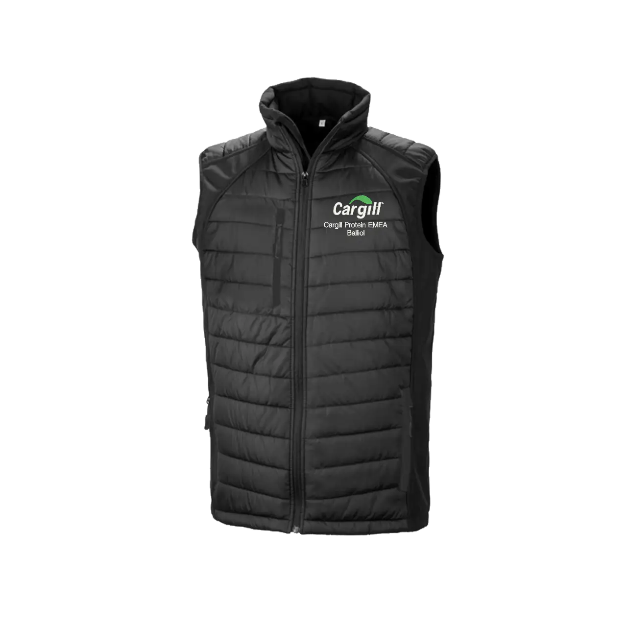 On-trend padded plus softshell combination. Supersoft, lightweight and warm. Ready to brand. Quiet to wear. Contrast colour pocket zips. Full front zip with chin guard. Stand-up padded collar. Padded body. Soft bound armhole. Black zip pulls. Hangtag.