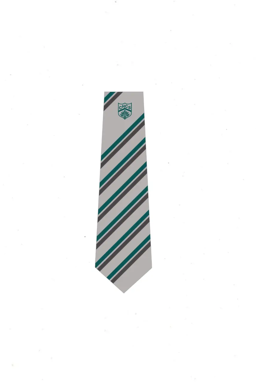 Grey with silver and teal stripes, Colton Hills logo on tie.