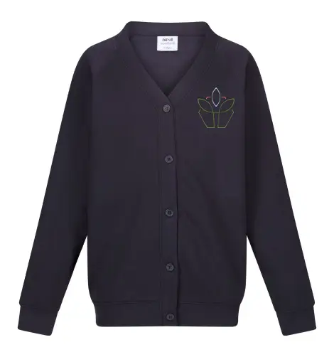 Ink Blue Cardigan with embroidered school logo.