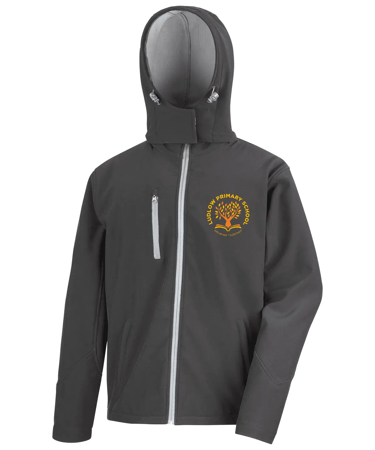 Ludlow Staff Black Soft Shell Jacket with hood.