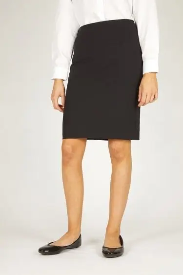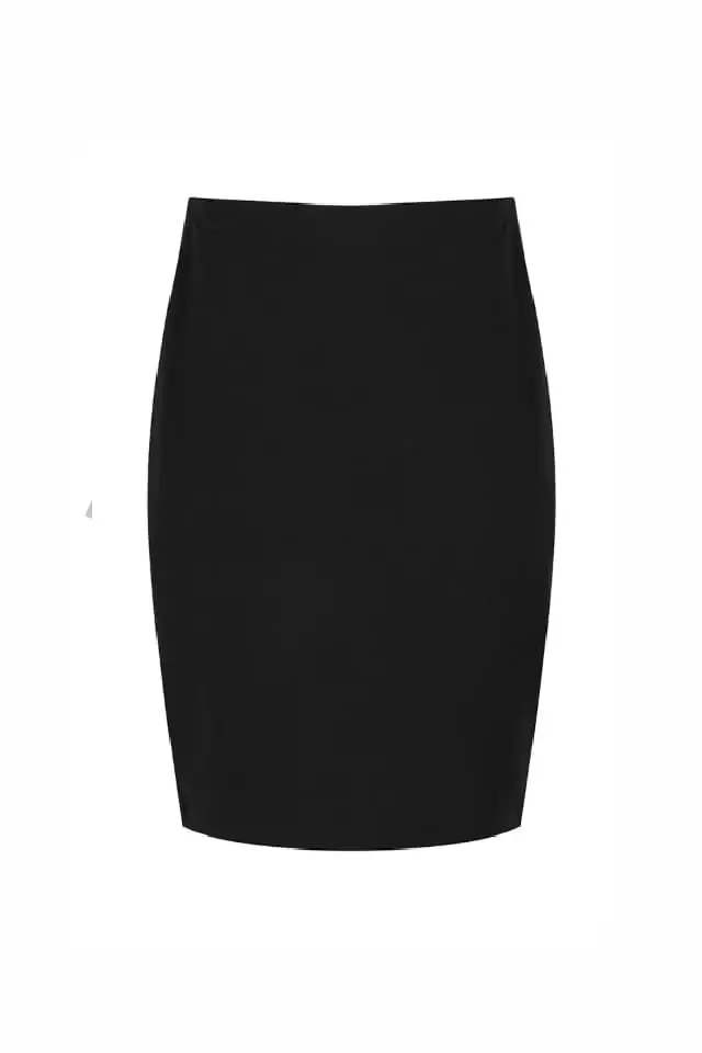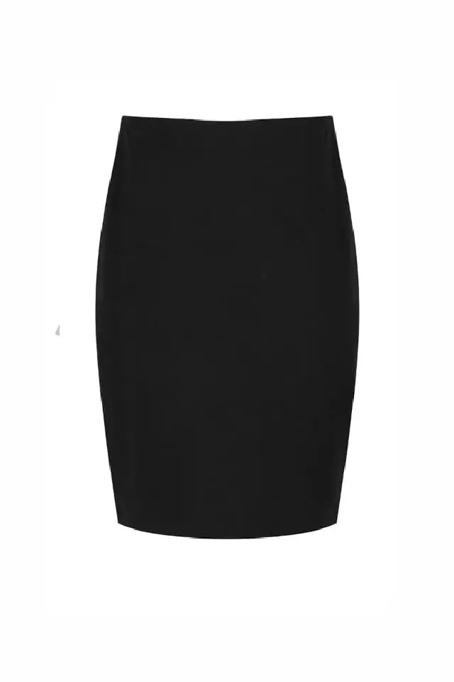 Girls black straight pencil skirt, in stretch fabric with back vent opening. No visible waistband.