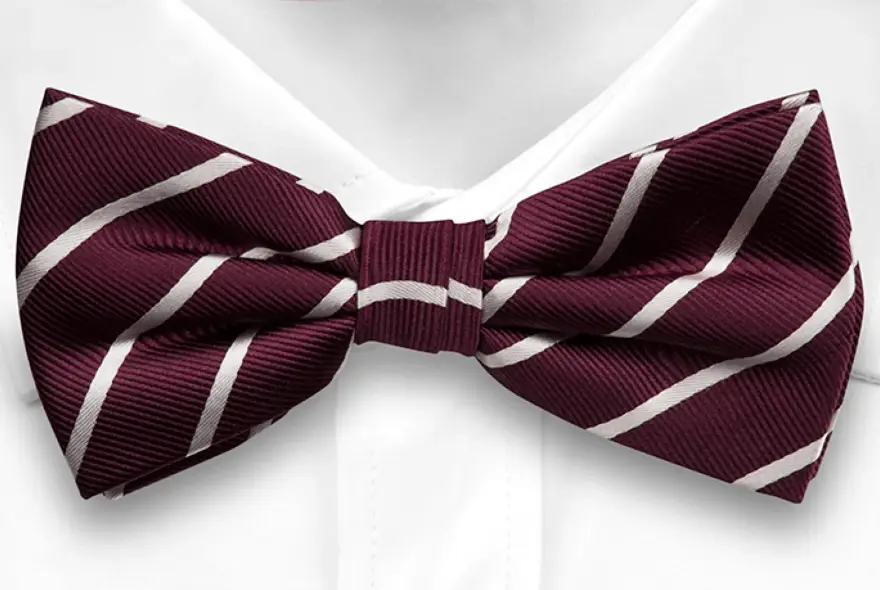 Thin striped St Benedict Biscop School bow in Maroon and Silver. Made in UK based factories.