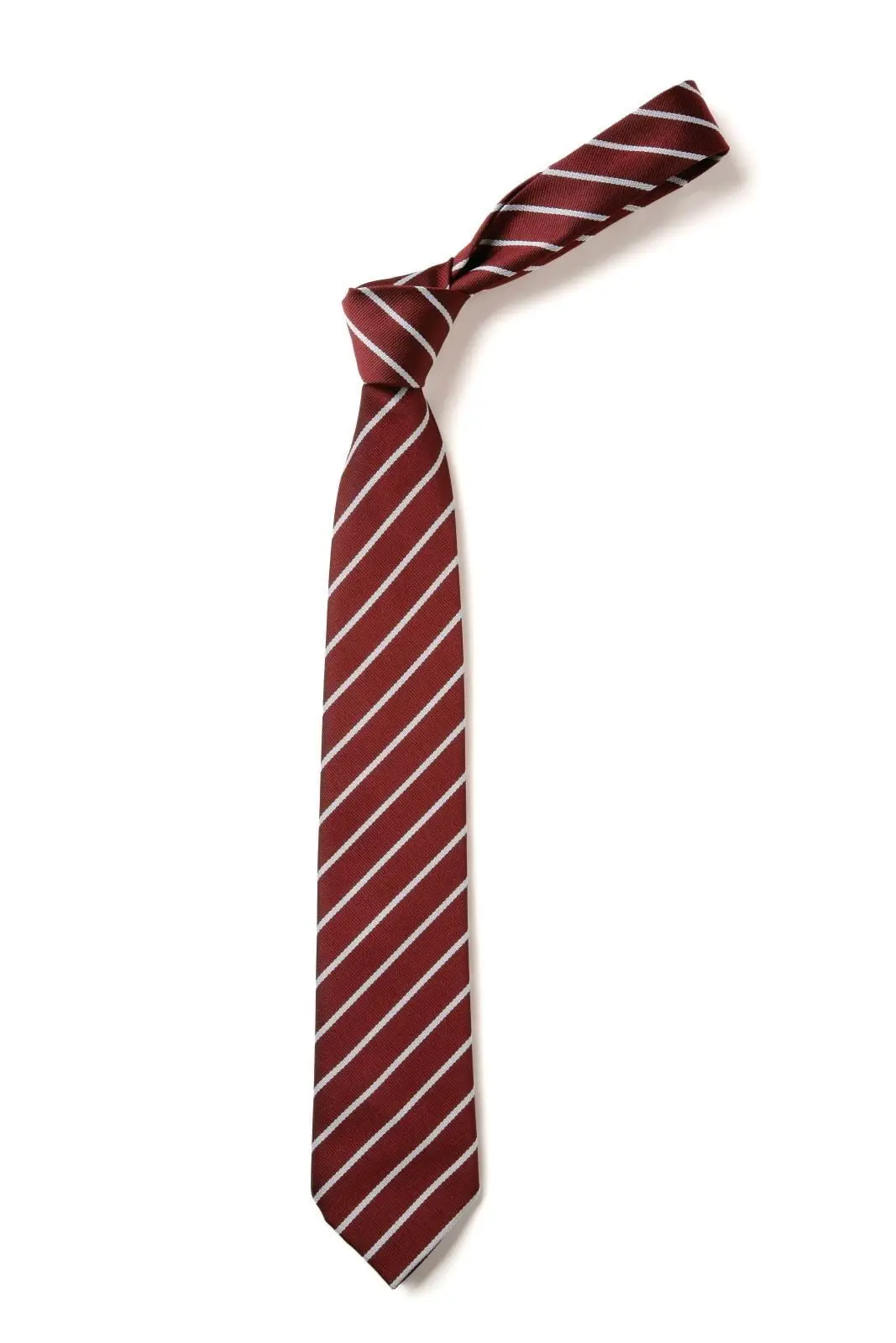 Thin striped St Benedict Biscop School tie in Maroon and Silver. Made in UK based factories.