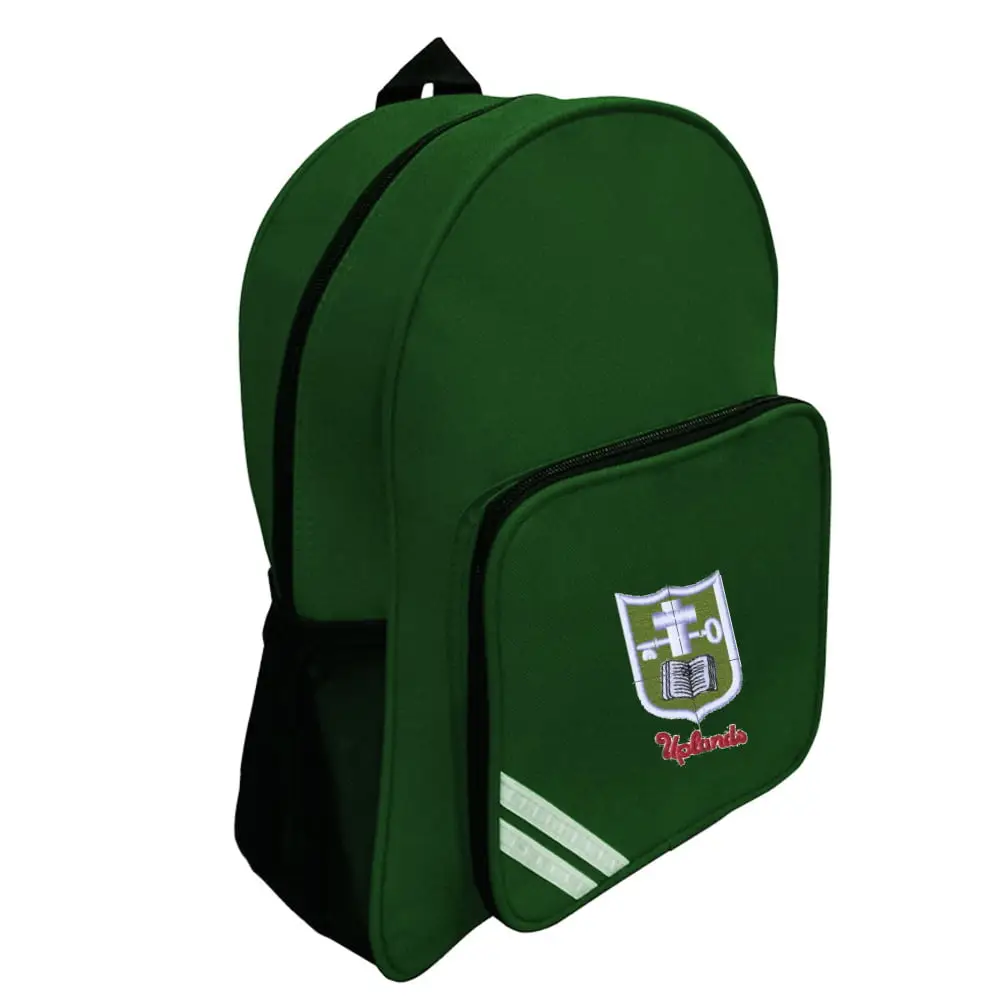 Mesh water bottle holder on the side of rucksack. Two main compartments to rucksack.