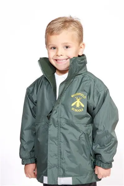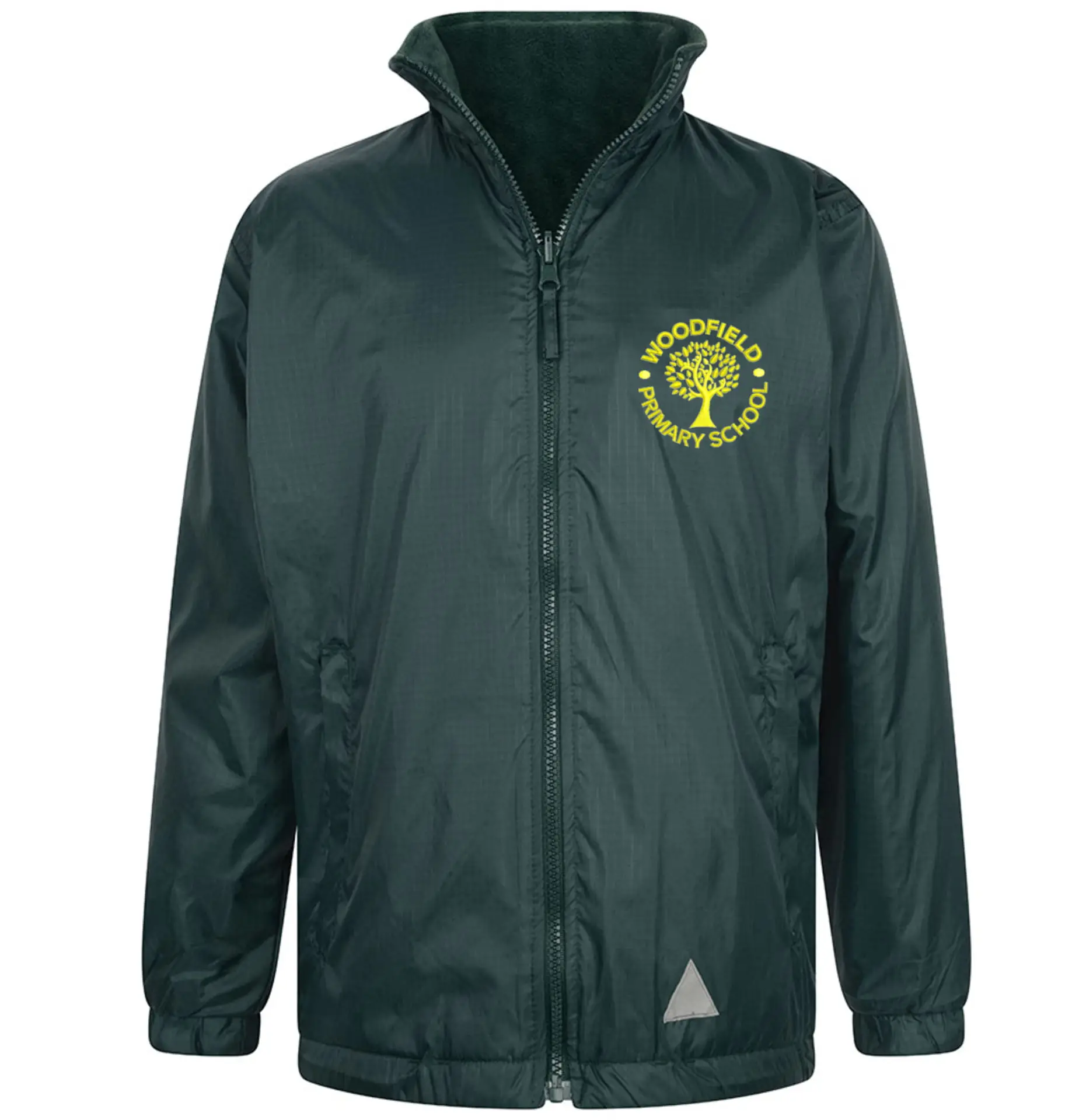 Inside fleece lined reversible jacket. Reflective safety patches. Concealed hood. Waterproof.