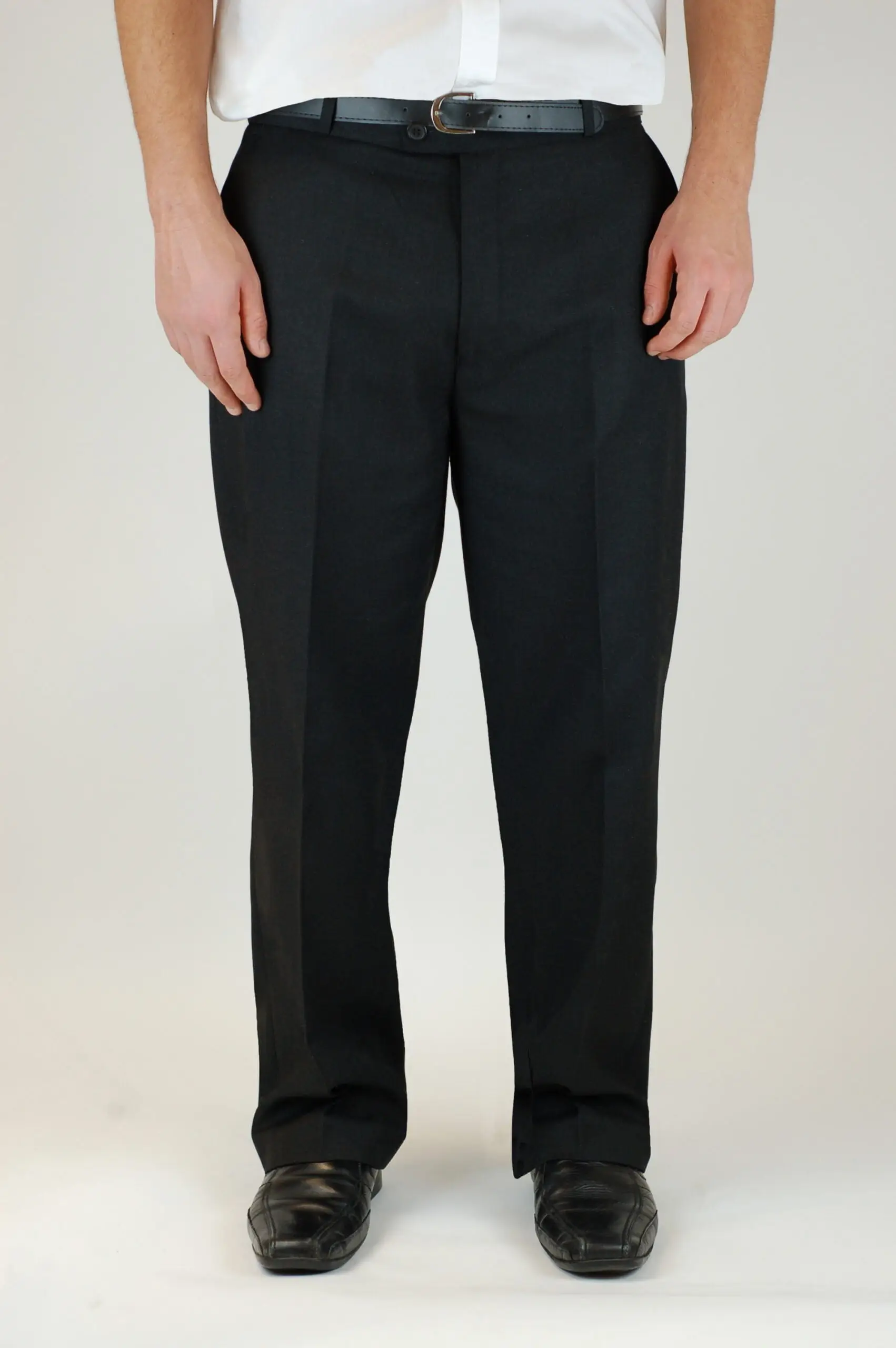 . Flat front with side and back buttoned pockets,